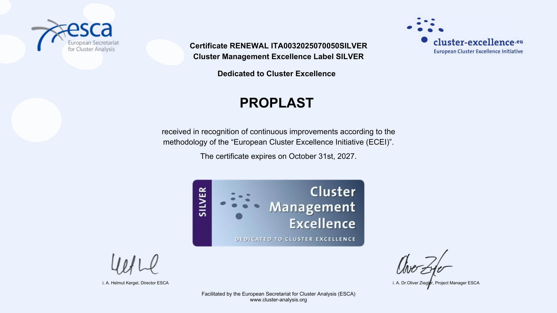 Siamo orgogliosi di annunciare che Proplast ha ottenuto il rinnovo della prestigiosa “Silver Label for Cluster Management Excellence”, riconoscimento attribuito da ESCA – European Secretariat for Cluster Analysis, organizzazione europea che valuta la qualità dei processi di gestione dei cluster. La certificazione…